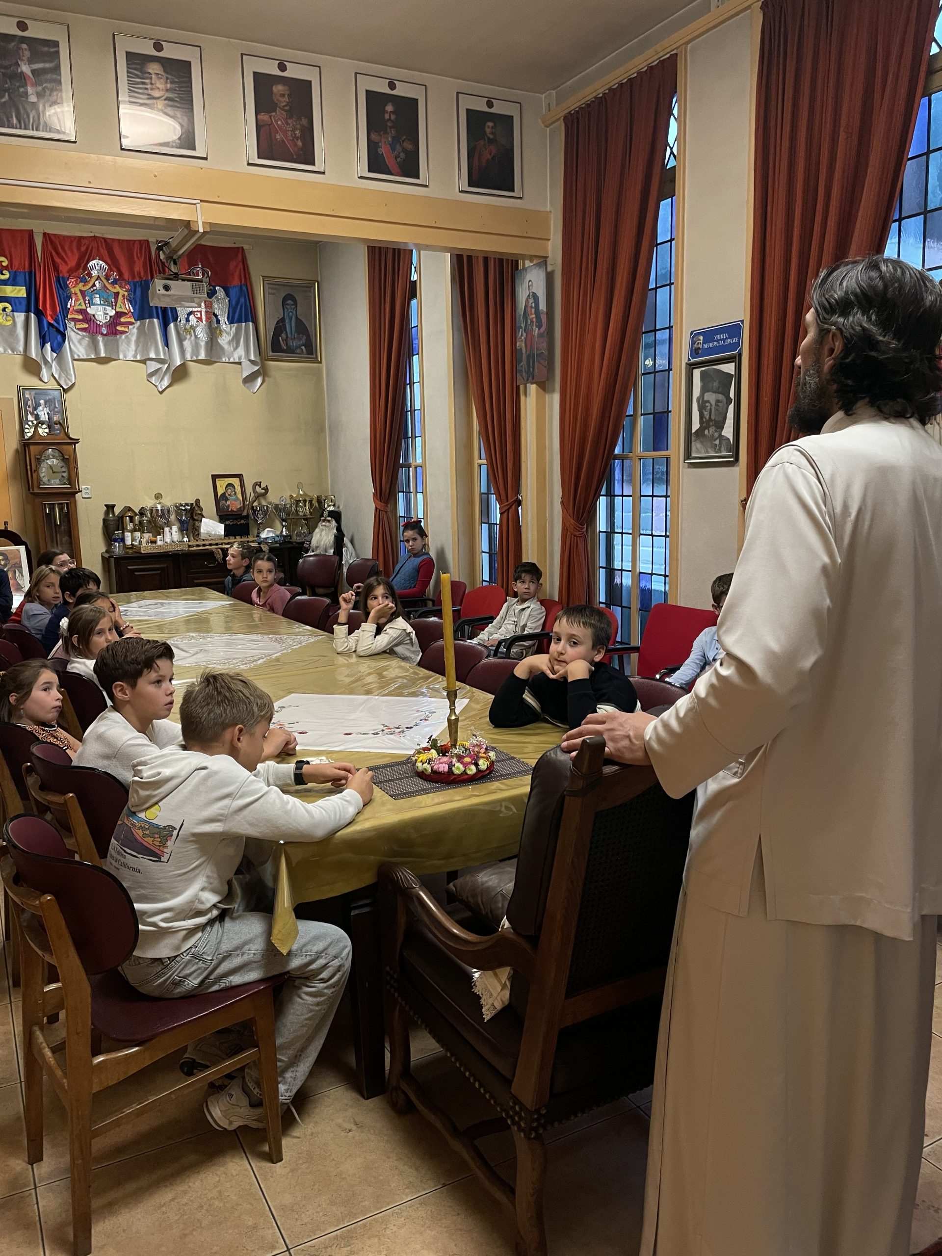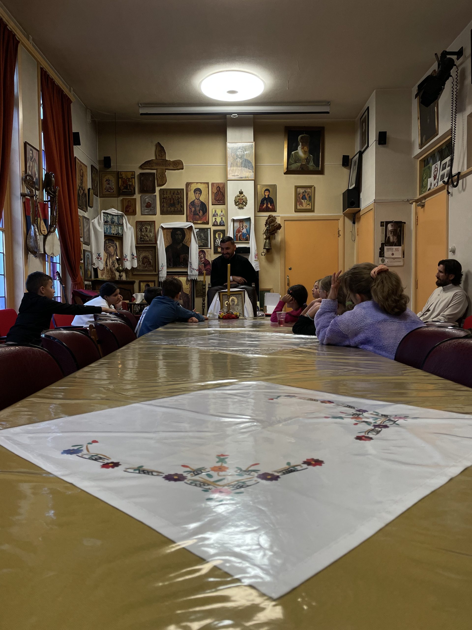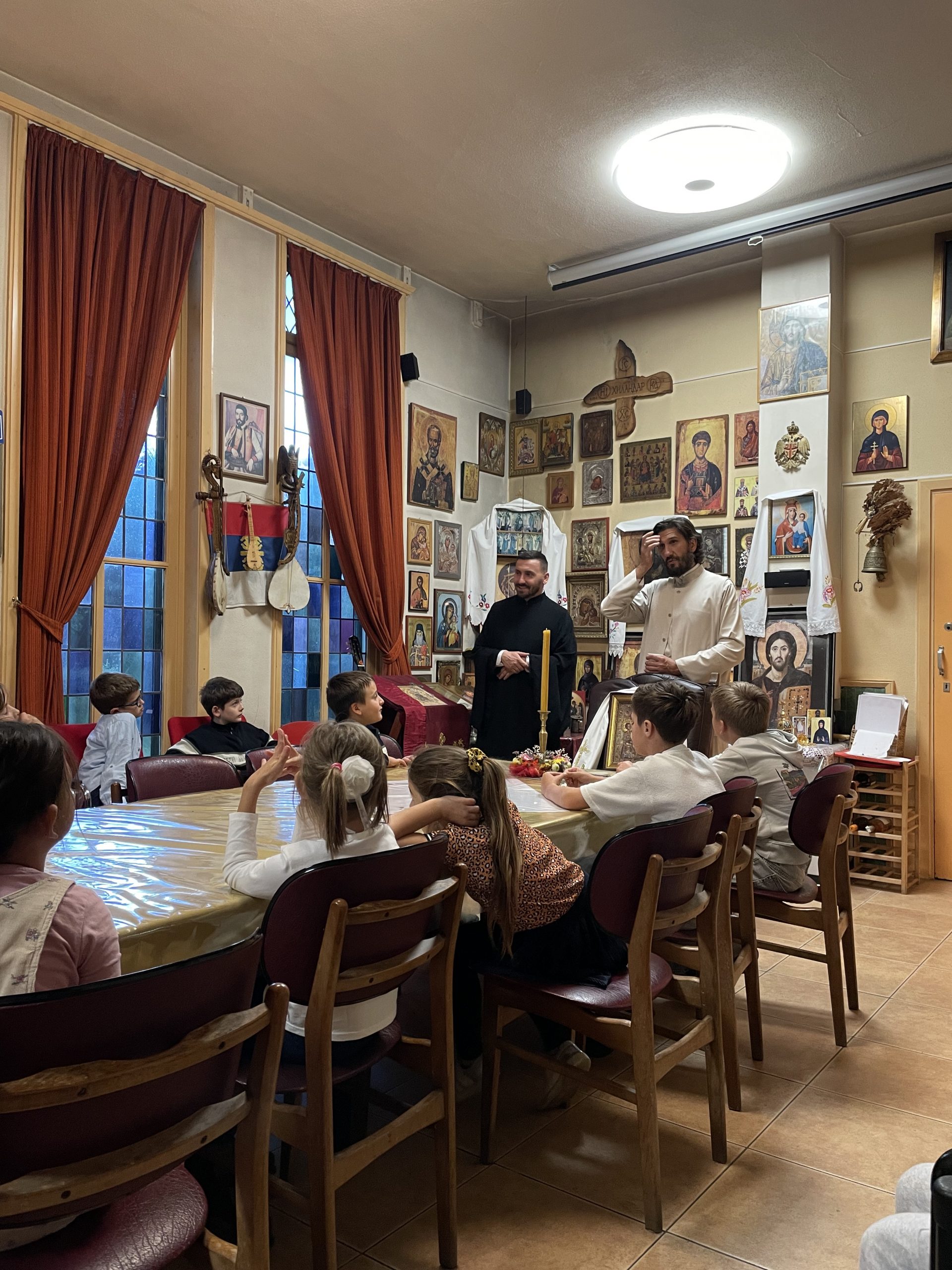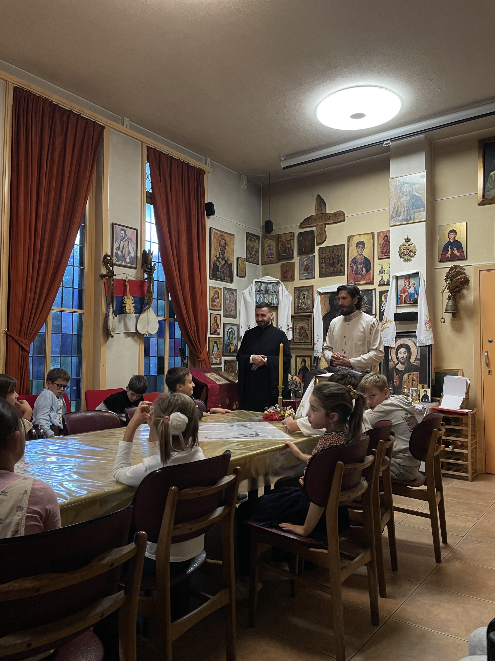 У наставку Свете литургије сва деца су отишла у парохијску салу на ручак који су припремили домаћини. После ручка деца су подељена у пет група: